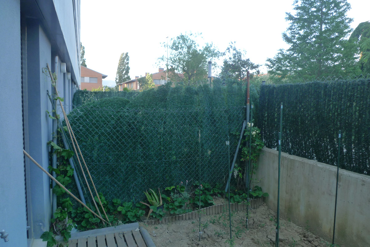 Singular uses or practices : C’est le rez-de-jardin secondaire à usage unique : le jardinage (tomates, persil, fraisiers, vigne). Les habitants des jardinets voisins paraissent investir beaucoup plus ce côté (tables et chaises, repas…), mais pas dans l’appartement observé, peut-être pour bénéficier d’une plus grande tranquillité en inversant les usages (contrepied-contretemps)
